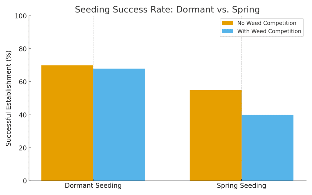 Unlike spring seeding, which fights with weeds, variable temps, and early drought risk, dormant seeding skips the competition. It takes advantage of winter’s quiet stretch to prepare for early growth.