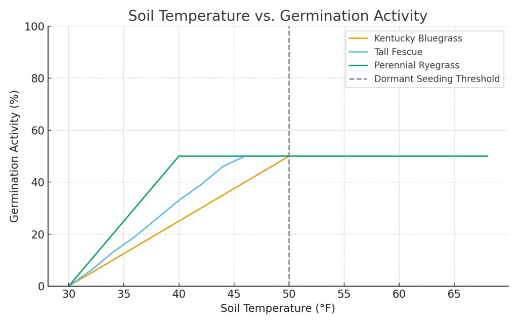 Dormant seeding means spreading grass seed when the soil is cold enough to prevent germination, but not frozen solid. That usually means soil temperatures below 50°F. The seed sits idle through winter, protected by freeze-thaw cycles and snow cover, then germinates in early spring.