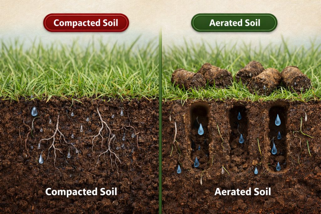 - If your soil stays wet: Aerate every fall to prevent compaction and moss buildup.